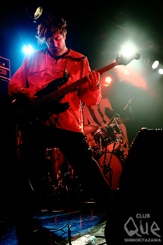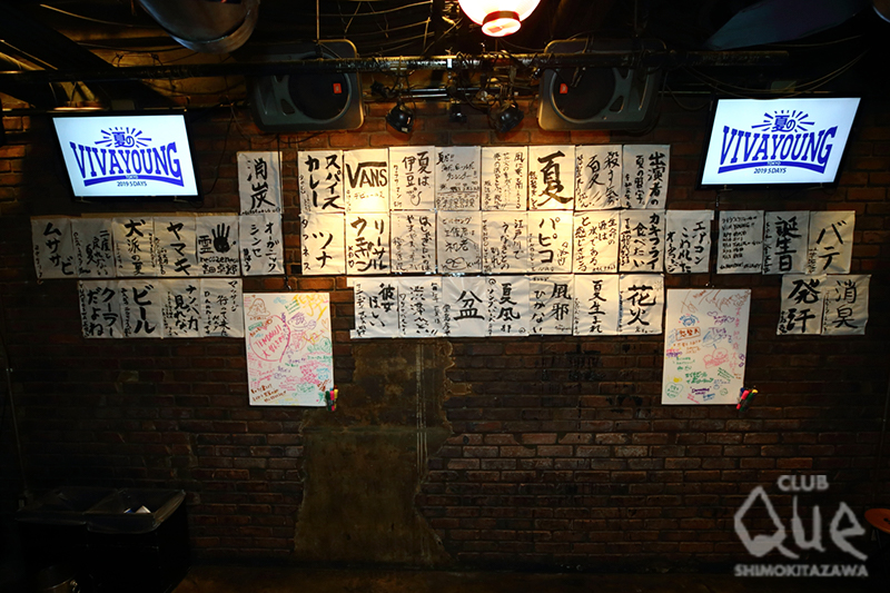 今夏のVIVA YOUNG!最終日の締めくくりは、ロックン・ロールで! 連日、出演者と来場者が書き足していった夏を題にした習字とメッセージボードが会場を賑やかに彩るなか、主催のクラヤマはDJをしながら観客をお出迎え。マリリン・マンソン「mOBSCENE」などヘヴィロックなナンバーを交えながら会場を温め、トップバッターのw.o.d.を呼び込んだ。「スコール」からゴリッゴリな脳天を揺さぶるグランジ・サウンドで圧倒すると、「THE CHAIR」へ。中島元良(Dr)のタイトなドラムにKen Mackay(Ba)の重厚なベース、2人の強力なリズム隊に、サイトウタクヤ(Vo.Gu)のノイズギターが強烈なサウンドとなり響いていて、疾走感溢れるナンバー「丸い真理を蹴り上げて、マリー」と、激しさは止むことなく轟音のディープな音圧がたまらない。ハードなナンバーを主にしつつ「みみなり」では、一転し穏やかながらもグランジらしい聞かせるナンバーも。激しさのなかに一点、クールさをまとったいい緊迫感のあるステージで観客を魅了した。
