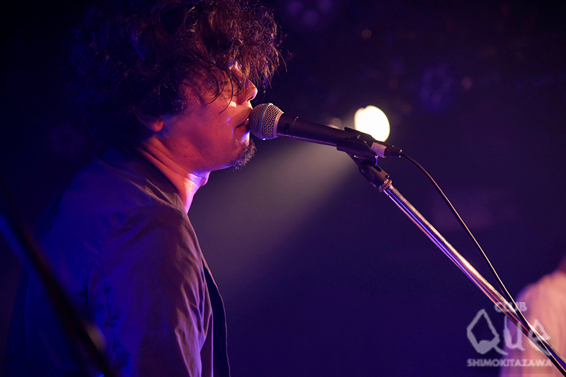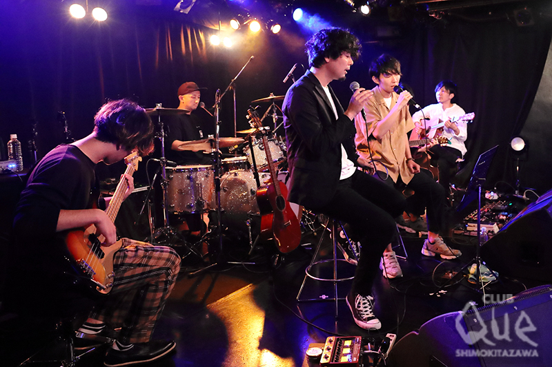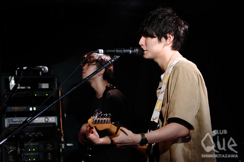 軽やかなビートが鳴り「ラブストーリー」のイントロが鳴るとDaishi(Ba)は、クラップを誘いながらグッとオーディエンスと距離を縮める。メンバーは息を合わせるように向き合い「サプライズ」へと続け、”ここ下北から化けていきましょうか”と兼丸(Vo.Gu)が投げかけ「化物」へ。順調に滑り出したと思いきや、”こ、これは緊張しているゾ!いつもとはちがう緊張!”と、MCでは終始カミカミなトークで大先輩との共演に緊張を隠しきれない兼丸。”精一杯歌いますので”とまっすぐと思いの丈を語った。続いて「最低だなんて」と再び揺れ動く想いを丁寧に歌い上げると、ミニ・アルバムより新曲「シーズンワン」を演奏した。兼丸は、海北との対談インタビューや“上部だけでない血の通った音楽”とLOST IN TIMEのライヴを観て感じたことを語ると”海北さんの、何だろう、あったかい塊みたいな。声もだけど…”と表現すると観客から思いがけないパワーワードに笑い声がこぼれる。その上で”今日、この曲を出さなきゃいけない”と思ったという、セミ・バラード「ふたりのうた」を披露。胸の片隅にある淡い恋心をくすぐるようなやさしいメロディを会場一杯に響かせる。終盤は”僕らのなかで一番明るい曲を!”とマサキ(Gu)鮮やかなギターの音色が鳴り「緑とレンガ」、そしてラストは想いを噛み締めるように「甘い記憶」を歌い締めくくった。