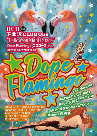 Dope Flamingo[Gu:博多めぐみakaTAKUちゃん,Sax:Yukarie,ポールダンサー&Vo:Rott,Key:BeBe,Ba:人神人,Dr:森秀輝]