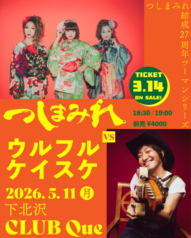 SCHEDULE 2026/05/11 (Mon) “「つしまみれ結成27周年ツーマンシリーズ」つしまみれ vs ウルフルケイスケ” つしまみれ|ウルフルケイスケ つしまみれ ウルフルケイスケ OPEN/START 18:30/ 19:00 チケット [観覧] ADV.¥4,000/DOOR. ¥4,500 [+1D] バンド 3/10 つしまみれライブ~ Que店頭 [16:00~21:00] 3/14~ イープラス 3/14 10:00~ ローチケ 3/14 10:00~