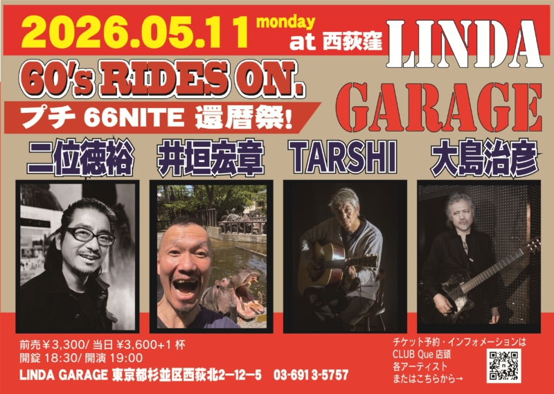 TOPICS 【開催決定!】“60’s RIDES ON. プチ66NITE還暦祭!” @Linda Garage 2026/01/14 【Linda Garageにて開催】 5/11 [MON] “60’s RIDES ON. プチ66NITE還暦祭!” ◆TARSHI ◆大島治彦 ◆井垣宏章 ◆二位徳裕 ⏰OPEN 18:30/START 19:00 [観覧] ADV.¥3,300/DOOR.¥3,600 [+1D] Que店頭 [16:00~21:00] 1/14~ TOPICSトップ